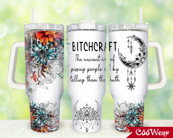 Bitchcraft Boho Moon and Flowers Magic and Celestial 30oz or 40oz Tumbler with Handle, Birthday Anniversary Tumbler Gift HFN