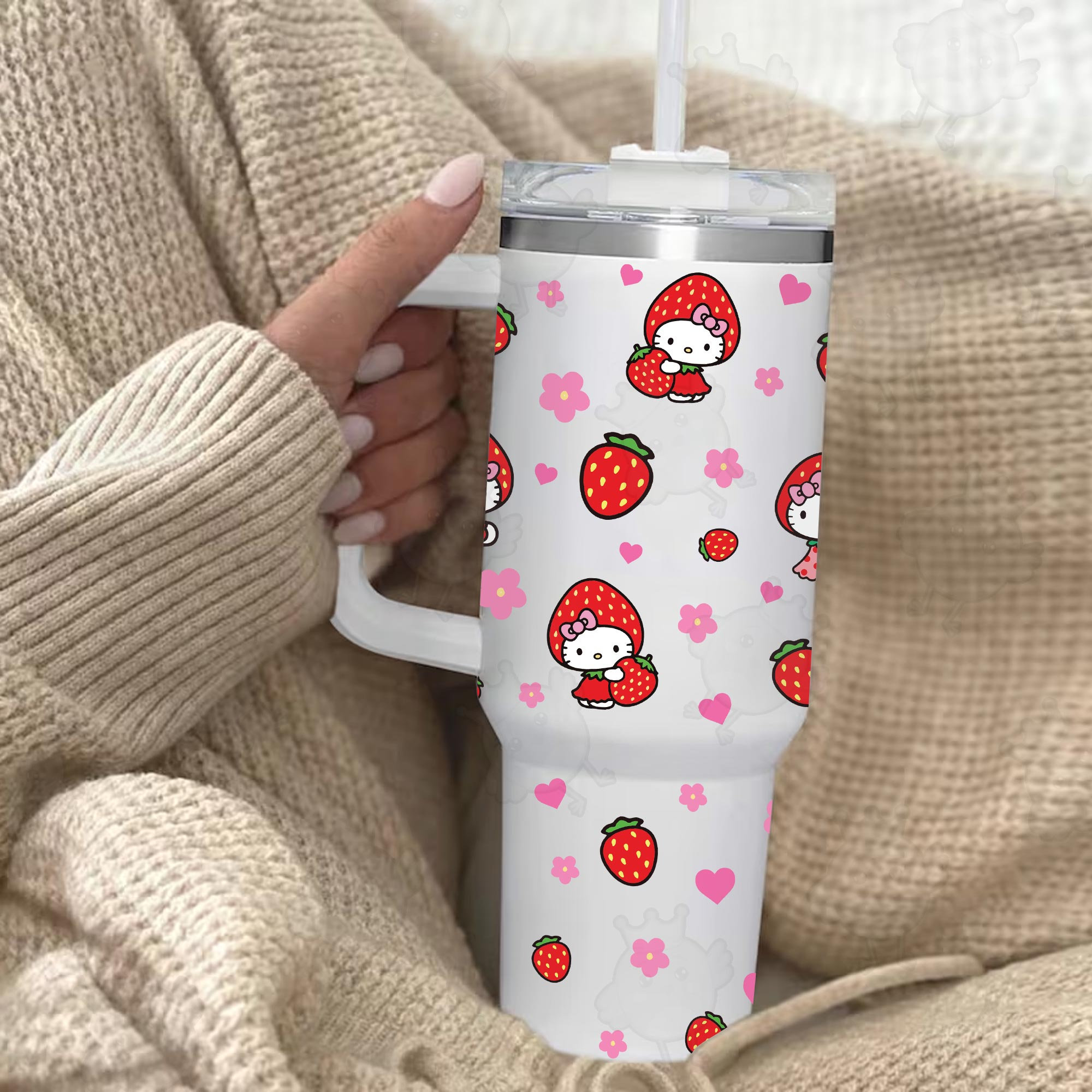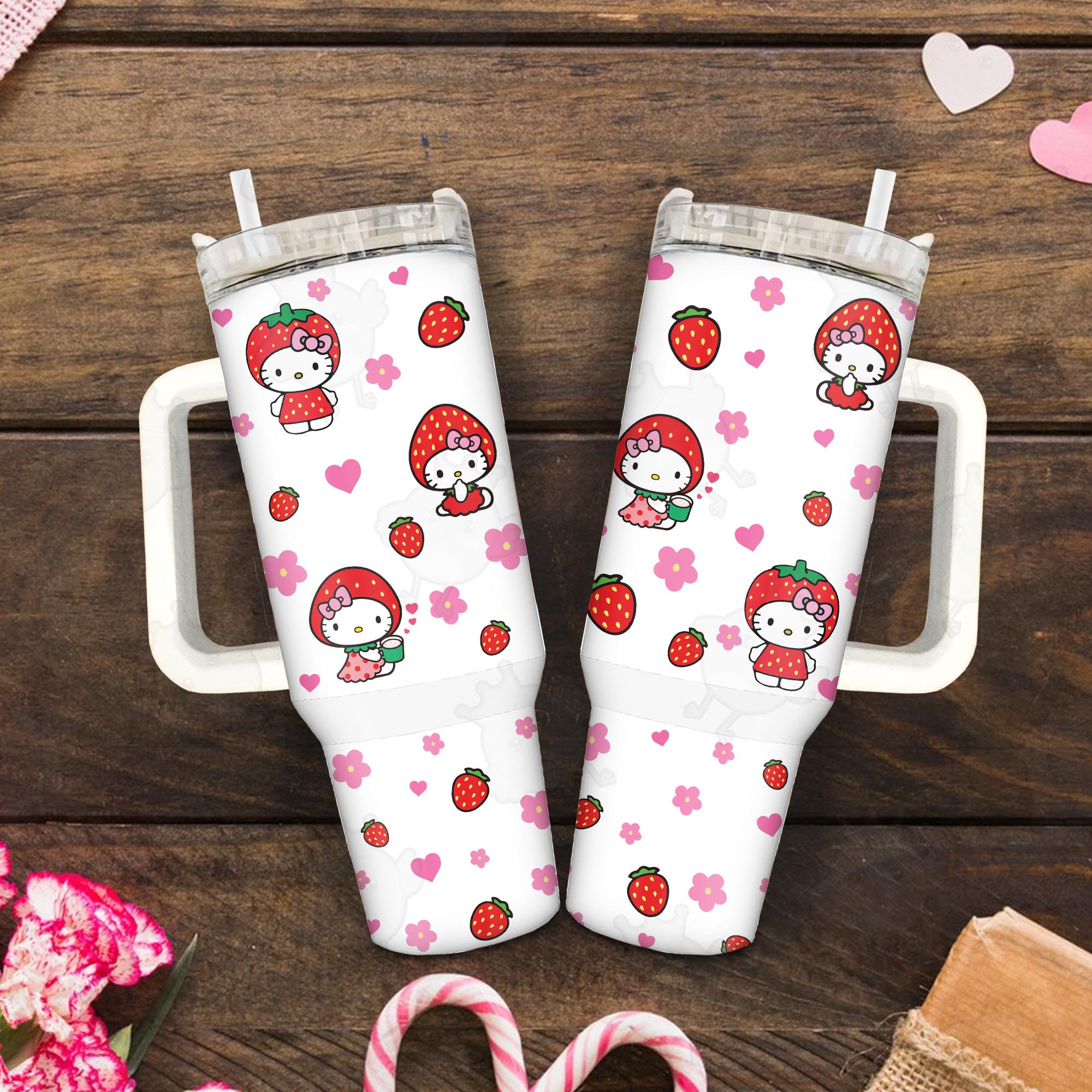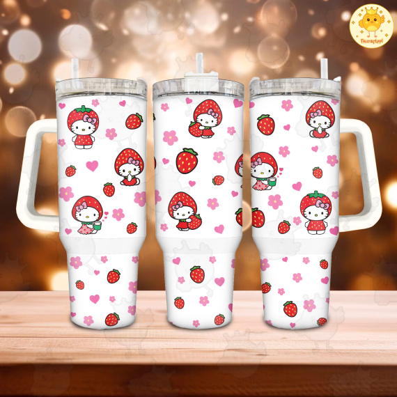 Strawberry Hello Kitty Happy Valentine Day 30oz or 40oz Quencher Tumbler, Valentine Cartoon 40oz Tumbler With Handle, Gift Valentine Tumbler HFN