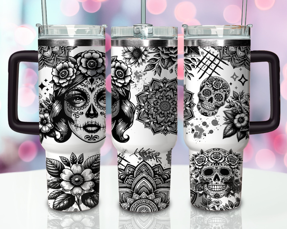Sugarskull Black And White 30oz or 40oz Quencher Tumbler Gift For Her Him Birthday Gift LN